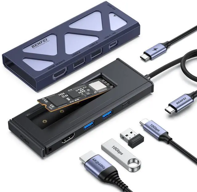 Dual-Purpose 6-in-1 USB-C Hub with M.2 SSD Enclosure2-in-1 design: Functions as both a high-speed USB-C hub and an M.2 NVMe SSD enclosure, saving space and cost. Expand storage & connectivity: 2×USB-A and 1×USB-C 10Gbps, 100 PD, 4K@60HZ HDMI and M.2 NVMe SSD slot (supports 2230/2242/2260/2280 sizes).