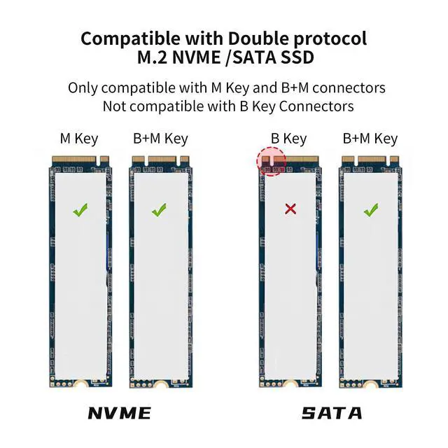 Attention: It supports PCI-E based M key / (B&M) key M.2 NVME SSD read/write speed up to 10Gbps; SATA-based B&M Key M.2 SSD read/write speed up to 6bps. Not compatible with B Key Connectors.