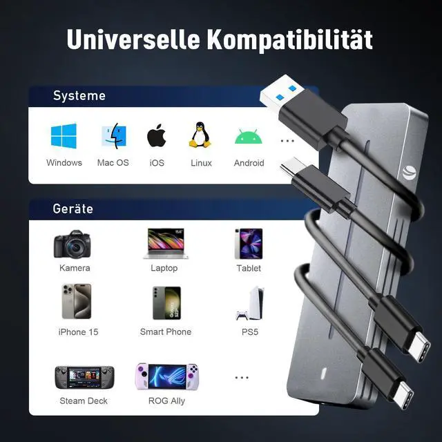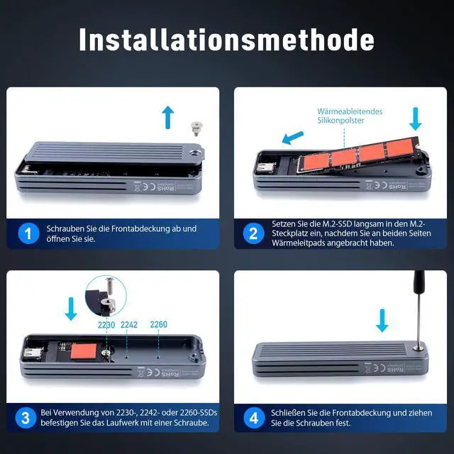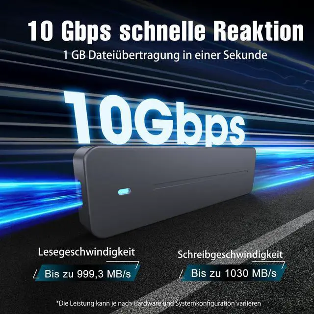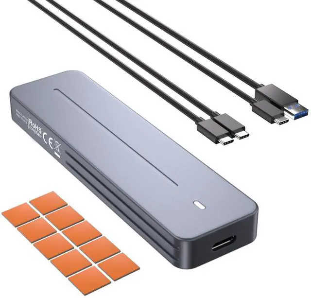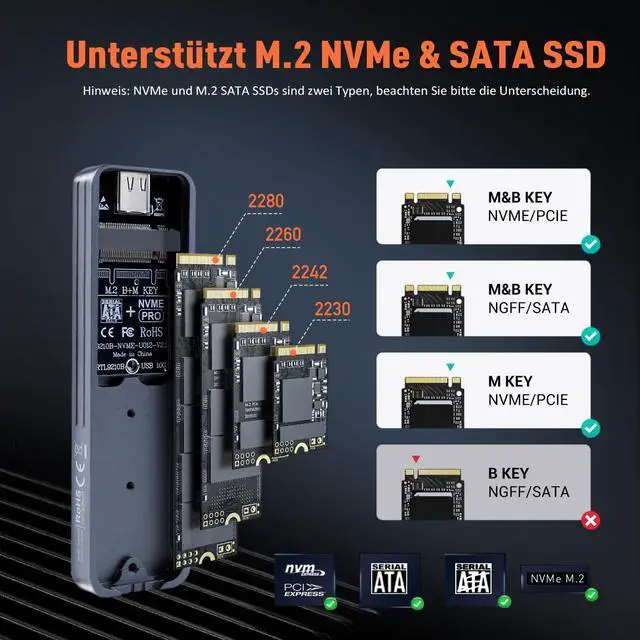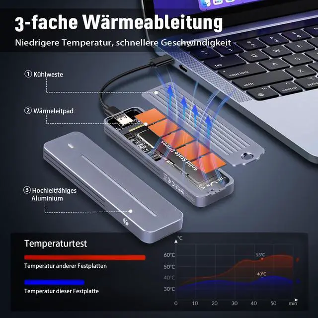 Excellent Heat Dissipation: The M.2 NVMe & SATA Enclosure is made of ultra-thin aluminum alloy and is compact and slim. Through optimised thermal design and reduced power consumption, the SSD maintains peak performance even under prolonged operation. Due to aluminium's high thermal conductivity, the surface may become hot during use. Please handle with care