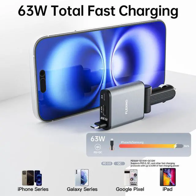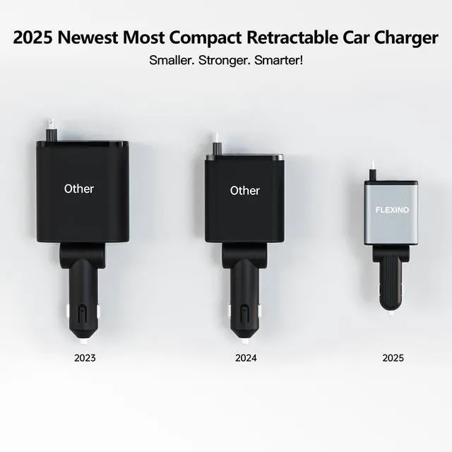 Engineered for drivers who demand both convenience and reliability, Flexino's 2025 retractable car charger delivers ultra-compact power exactly when you need it. Our patented auto-retract system keeps your cockpit clutter-free while advanced safety chips protect your devices mile after mile."
