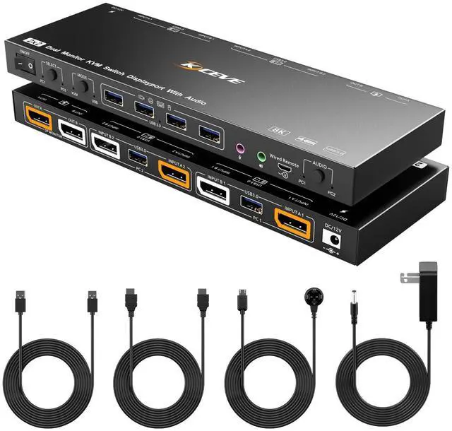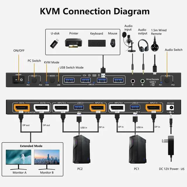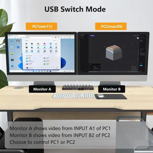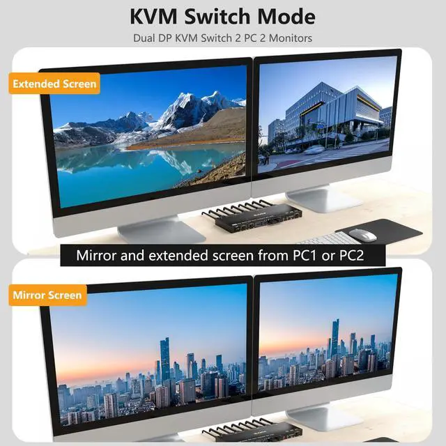 - This dual monitor KVM DP switch is for 2 computers share 2 monitors, keyboard, mouse and USB devices. Please connect all cables to make 2 display work properly.