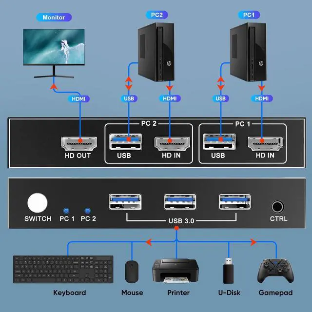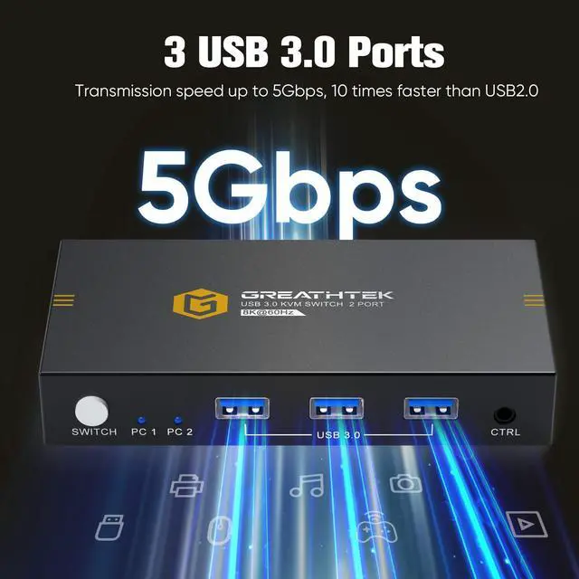 Supports USB3.0 with a transfer rate of up to 5Gbps, which is 10 times higher than USB2.0. Compatible with USB 2.0/USB 1.1. You can share USB devices between 2 computers to get rid of the hassle of repeated unplugging and plugging.