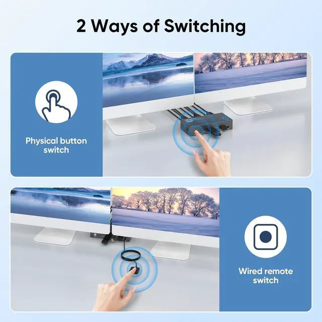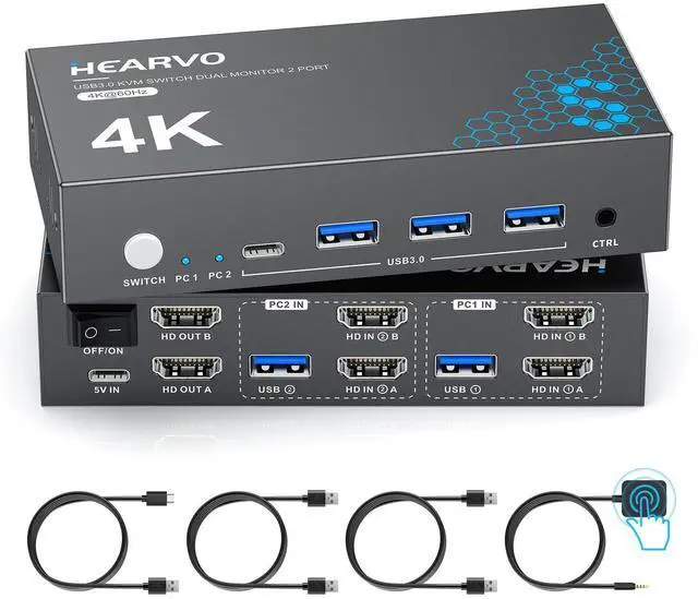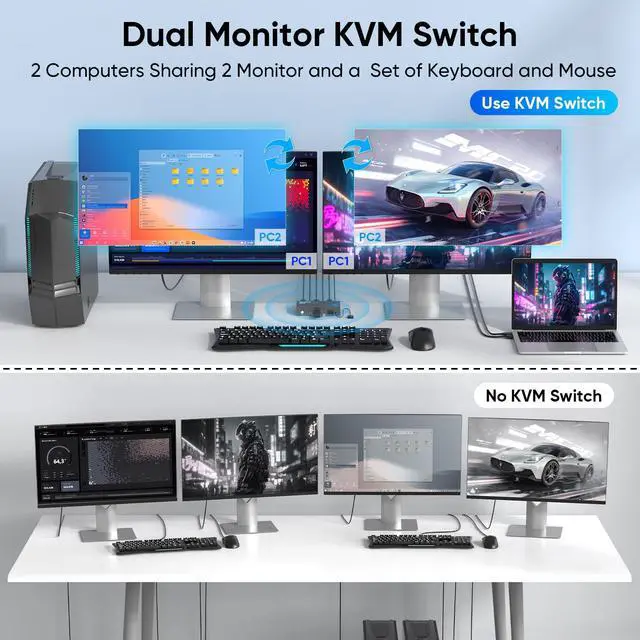 HDMI KVM Switch 2 Monitors 2 ComputersThis HDMI KVM switch is equipped with two HDMI ports, enabling a single set of keyboard and mouse to control two computers sharing dual monitors. It integrates USB+HDMI dual switching functionality and is compatible with Windows 7/8/10/11/Vista/XP, Linux, Mac, PS4, and other gaming consoles.
