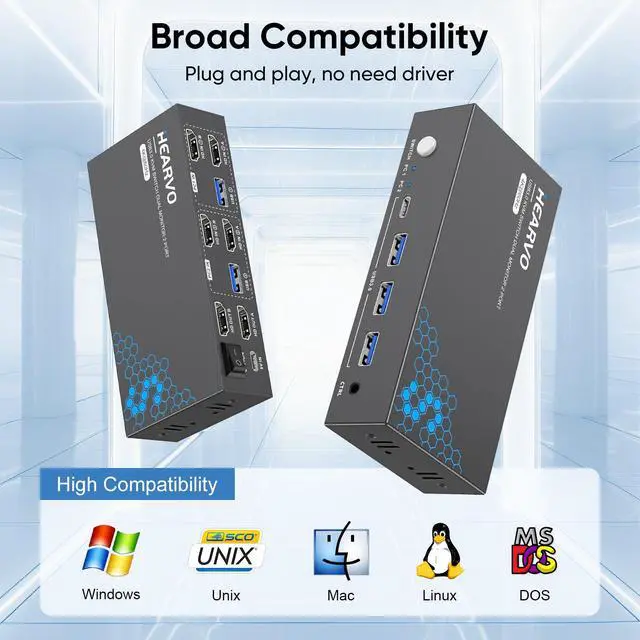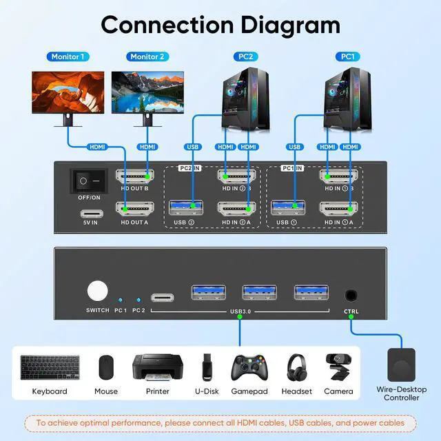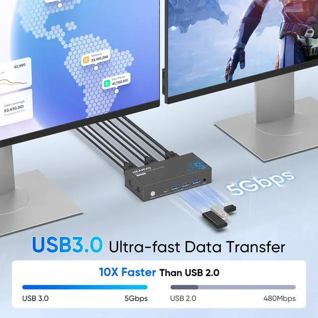 Four USB 3.0 Ports (3×USB-A + 1×USB-C) This KVM switch features 4 USB 3.0 ports with ultra-fast data transfer speeds up to 5Gbps, including 3 USB-A ports and 1 USB-C port for broader device compatibility. It allows you to seamlessly share peripherals between two computers, reducing cable clutter and improving workspace efficiency. Perfect for connecting and sharing USB devices such as keyboards, mice, scanners, printers, flash drives, headsets, and webcams. The switch automatically detects and recognizes connected devices for stable and reliable performance.