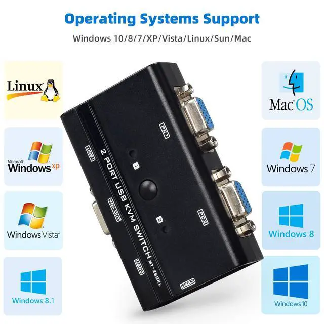 The 2-port KVM switch supports multiple operating systems including Windows, Sun, and Mac. Its compact size makes it ideal for home and business environment.