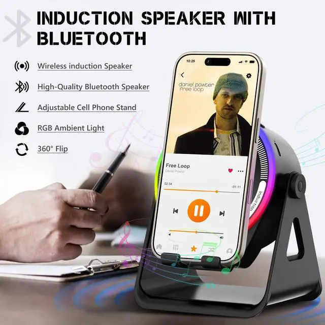 Wireless Induction Speaker, Multifunctional Bluetooth Phone Holder with RGB Light & 360 Rotation, HD Surround Sound, Compatible with iPhone/iPad/Android/Samsung