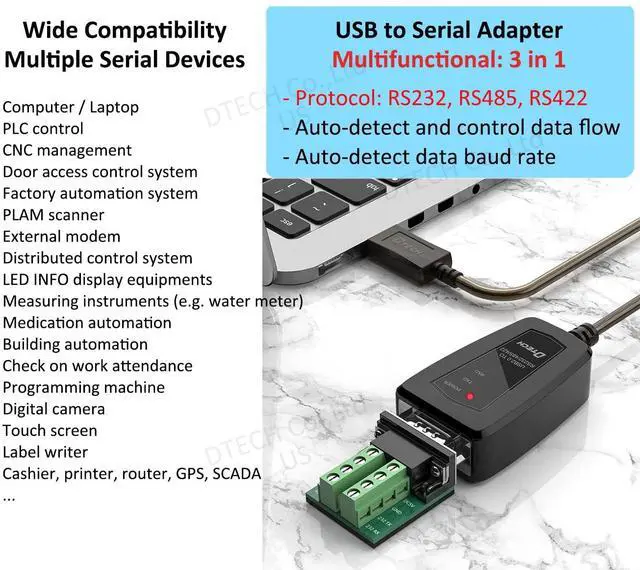 USB to RS485 serial adaptor cord is a high quality industrial plug and play serial bridge dongle, ideal solution for multiple devices like router, GPS, scanner, controller, label writers, programmer, modem, digital camera, card reader, palm PC and organizer, PLC control, laboratory testing, material handling equipment, etc.