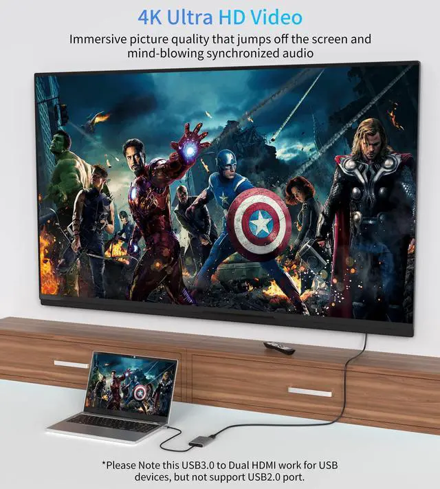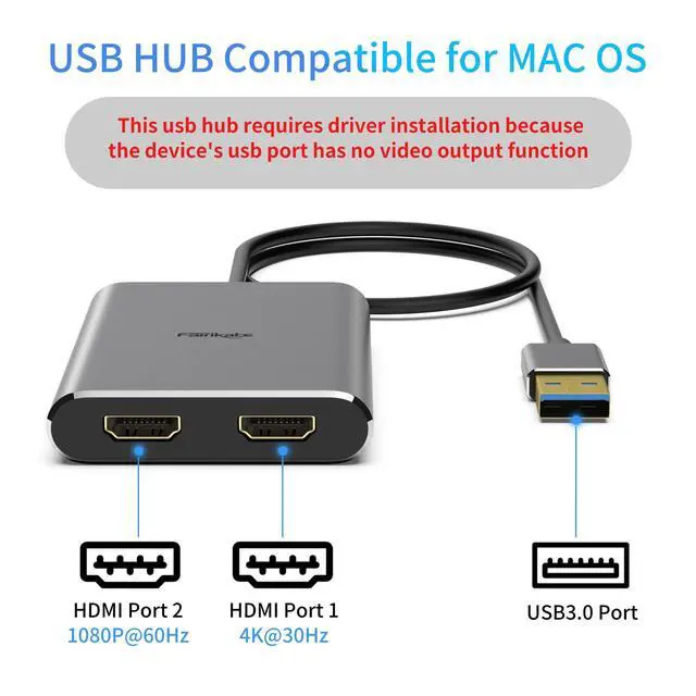 4K Ultra HD HDMI Adapter2 HDMI of this USB HDMI adapter can be expanded at the same time, port 1 up to 4K@30Hz resolution, port 2 up to 1080P@60Hz. USB to HDMI adapter designed for USB devices with full HD video resolution, is an excellent choice for expanding video practical tools.