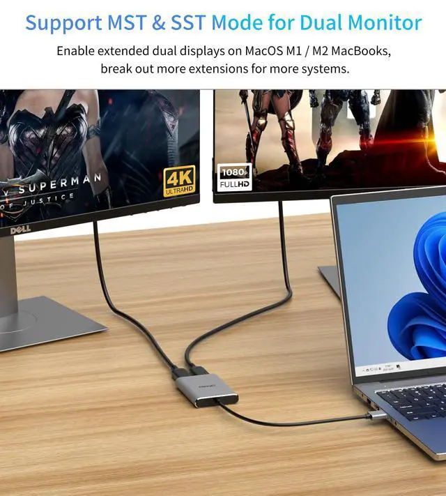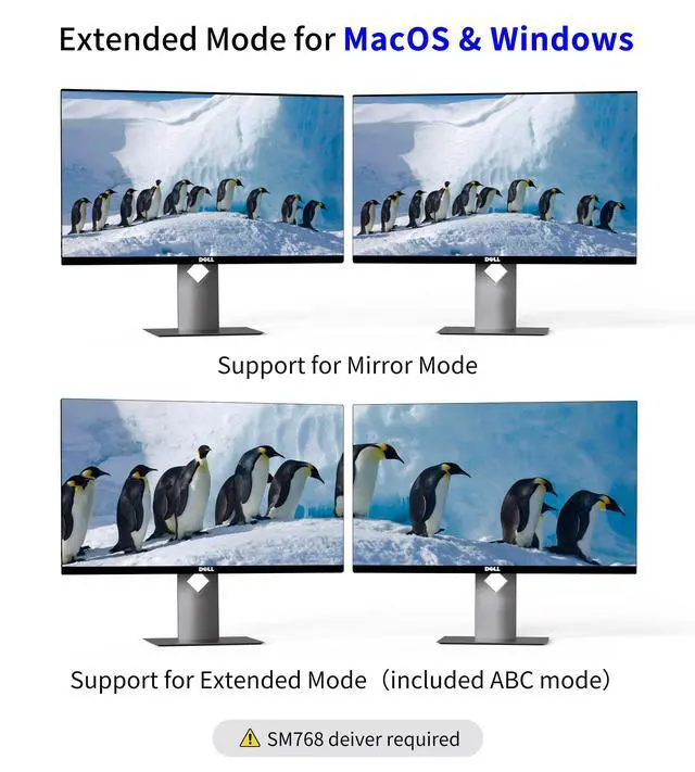 Support MacOS MST Extension Please note SiliconMotion drivers is requied. USB to HDMI dual monitor adapter supports mirror mode(A-A-A) and extend modes(A-B-B & A-B-C) for Windows/Mac OS, this USB 3.0 to HDMI adapter breaks the limitation of mac OS video extension. USB dual HDMI adapter for 2 monitors unlocks ABC extension mode for Mac OS allows you to do multiple tasks at the same time by extending 2 large screens/monitors. ***The adapter cannot break out the limitation of the number of the displays the graphic cards support, most inteal integrated graphics only support 3 monitors, including the laptop screen