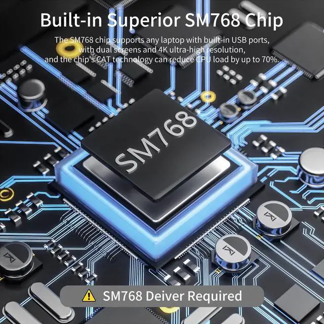 Reliable SM768 ChipHDMI USB adapter use SiliconMotion's premium chip SM768, which is a high-performance graphics processor. SM768 chip of this USB HDMI adapter supports any laptop/computer with built-in USB ports, has dual monitors and 4K ultra-high resolution, and the chip's CAT technology can reduce CPU load by up to 70%.