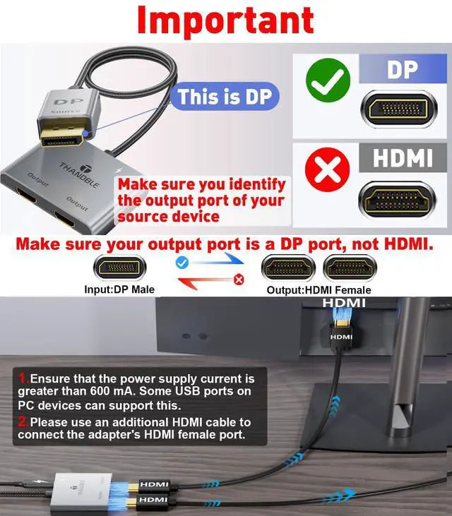 DP to Dual HDMI Splitter: This DP 1 in 2 HDMI out splitter can convert the signal of a DisplayPort port into two HDMI signal outputs, and can be connected to two monitors for work and entertainment at the same time, supporting extended mode and mirror mode. Meet your needs for more screen display (Note: It is required to use a current greater than 600 mA to connect the USB-C power cord. Some USB ports of PC devices can support this.)