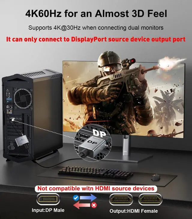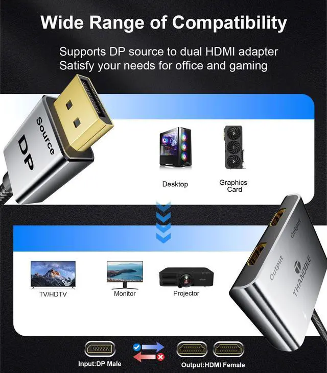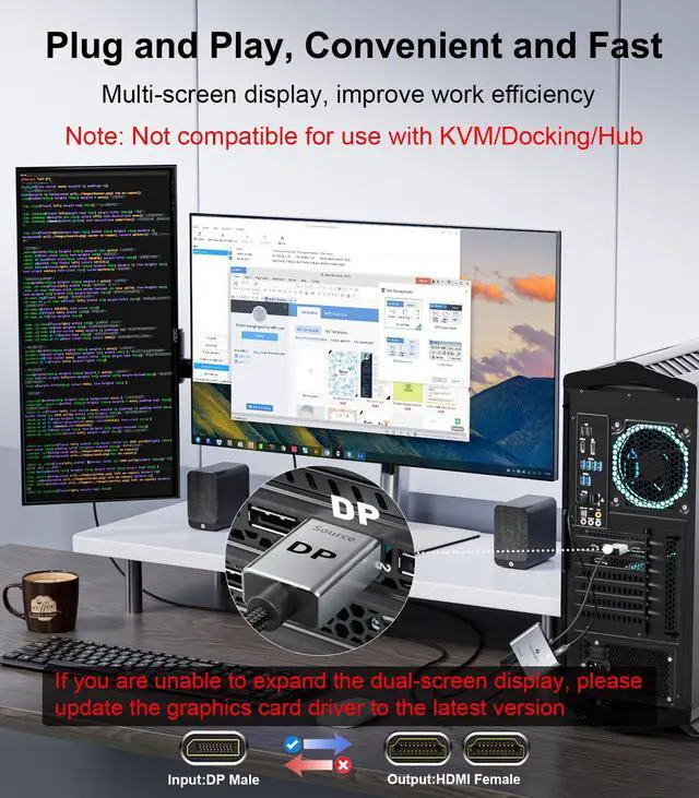 Wide Compatibility: We use top-of-the-line chips that are compatible with all devices on the market with DP/DP++/DisplayPort++ source ports, such as desktop computers (HP, Dell, Lenovo), graphics cards (AMD, NVIDIA). The graphics card needs to support a bandwidth of more than 18Gbps; otherwise, it will not be possible to expand the display of multiple monitors. (If there is no display, please update your graphics card driver to the latest version)