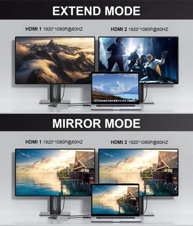 - This dual hdmi output ports can work simultaneously, which allow you to connect device with USB 3.0 Type A/Type C port to two external monitors or HDTV via hdmi cable. Providing a high-definition graphic image/video to your HDTV or monitors at resolution up to 1080P.