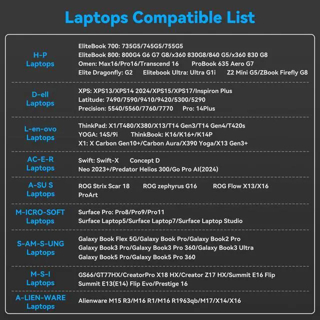 | D-e-ll Laptops | XPS (XPS13/XPS14 2024/XPS15/XPS17/Inspiron Plus), Latitude (7490/7590/9410/9420/5300/5290), Precision (5540/5560/7760/7770), Pro Series (14 Plus) |