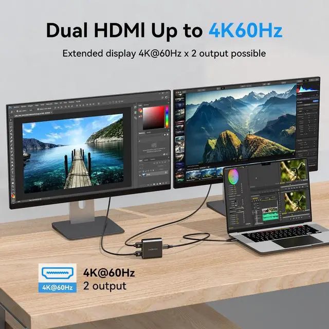 - Supports up to 3840*2160@60Hz resolution for two displays simultaneously.