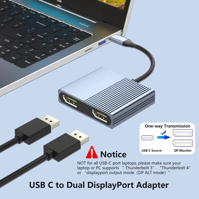 Connect this USB C to dual displayport adapter via a single USB-C port on your laptop to mirror or extend two additional monitors.