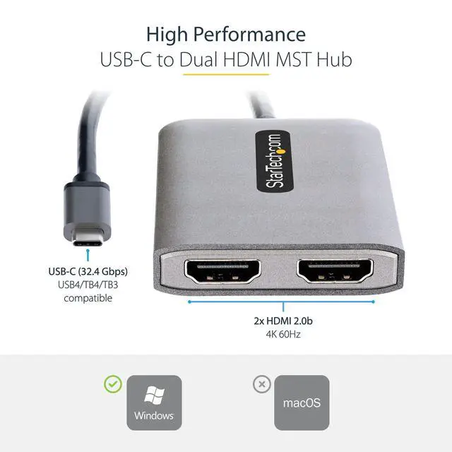 Windows devices that support DP Alt Mode over USB-C feature native support for MST. This USB-C to HDMI hub is compatible with Thunderbolt 4, Thunderbolt 3, and USB4 enabled Windows devices.