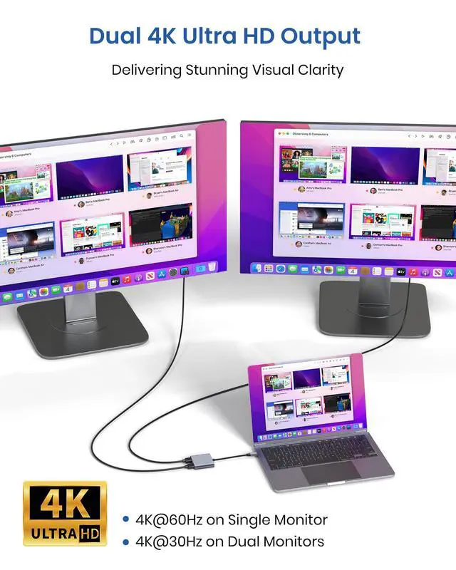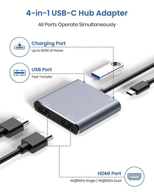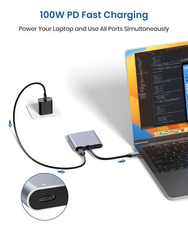 | About charging | The PD charging port is for charging only, not for data transfer. For a better experience, when you use the usb c adapter hub, please charge via the original PD charger. Please plug in your laptop's power adapter before connecting multiple monitors. If your laptop's c-port does not support the PD protocol, charging will not be possible. |