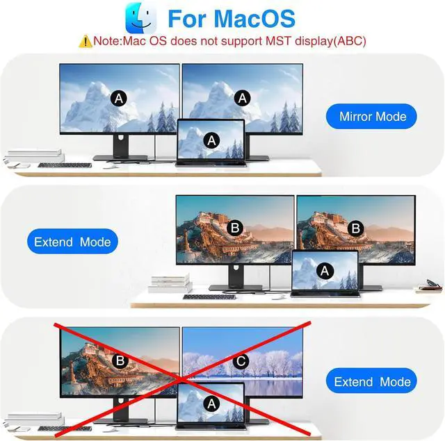 Does not support 2 external displays show different images for Apple computers in extend mode.