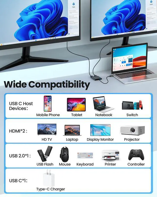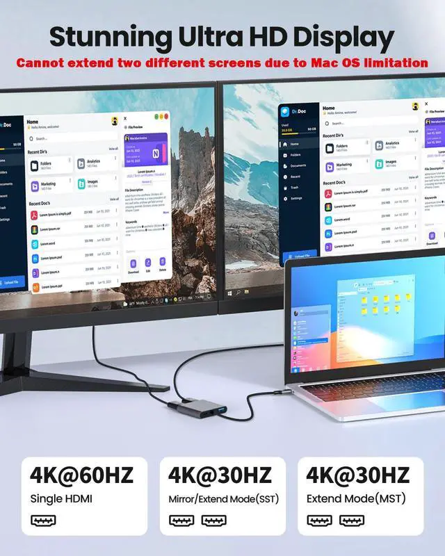 Our dual HDTV 4-in-1 dock offers fast and reliable data transfer, ensuring quick and efficient connectivity for all your devices. ????????: Ensure your device and HDMI cable support HDMI 2.0 or higher for full 4K resolution.