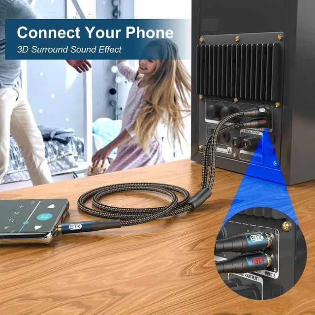 3.5mm to 2RCA cable will be the best choice for your home theatre,TV, Receiver,Car, Speakers and More. You can plug the 3.5mm male end with your phone or pc, and then 2RCA end to the left and right auxiliary inputs on your sound system. The 24K gold-plated connector allows you to plug it to your phone without taking off your phone case.