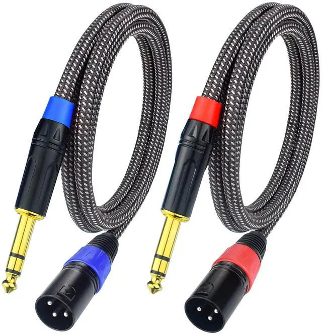 The package include two balanced 1/4inch TRS to XLR male cable, each cable is 3.3 feet long, please double check if the length is suitable for your connection. One cable has red rings and the other has blue rings, both are heavy duty braided cable.