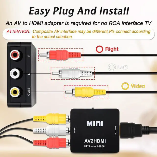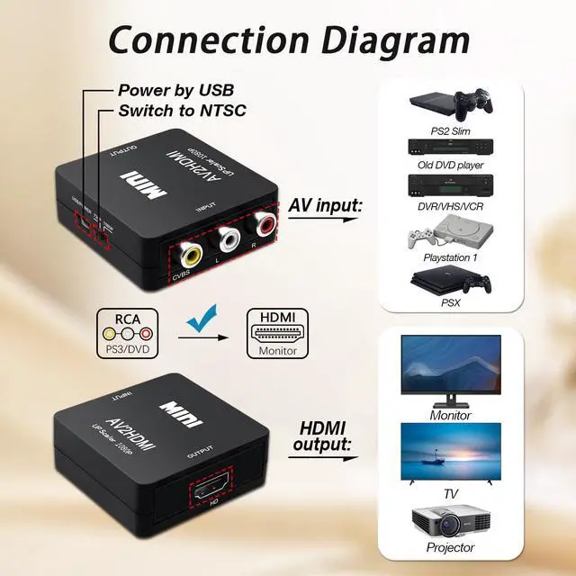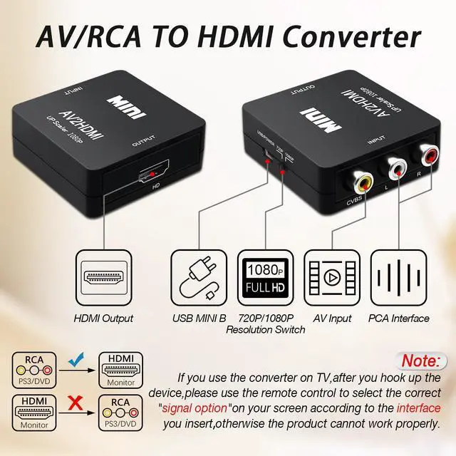 1080P RCA to HDMI Converter1080P Mini RCA to HDMI Converter Adapter Supporting PAL/NTSC for TV/PC/ PS3/ STB/Xbox VHS/VCR/Blue-Ray DVD Players.AV to HDMI converter no need any drivers, just plug to play.Please remember to hook up the USB power cable (included) to 5V power source to make it work.
