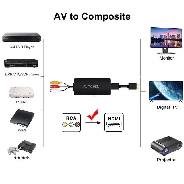 Convert analog composite RCA input to HDMI 1080p output to connect to high-definition TV, so you can watch old equipment sources on HD TV.