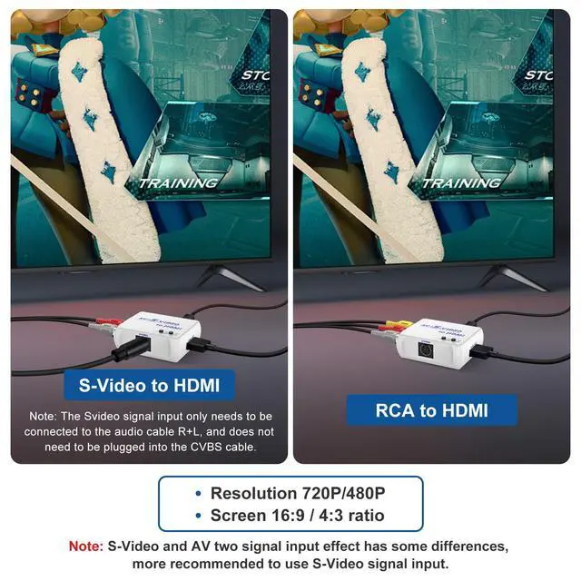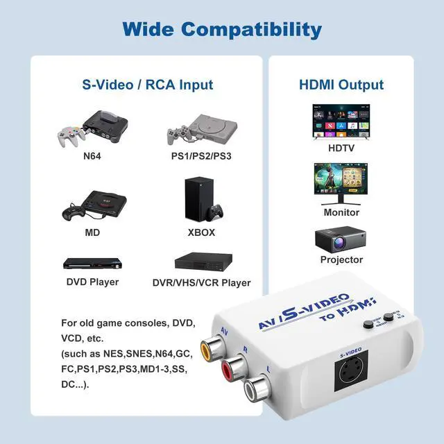 Our RCA + S-Video to HDMI ConverterIt converts S-Video/AV (RCA, composite, CVBS) signals into HDMI signals so you can watch your video on a modern TV with HDMI ports.Bring back your old and cherish memories.