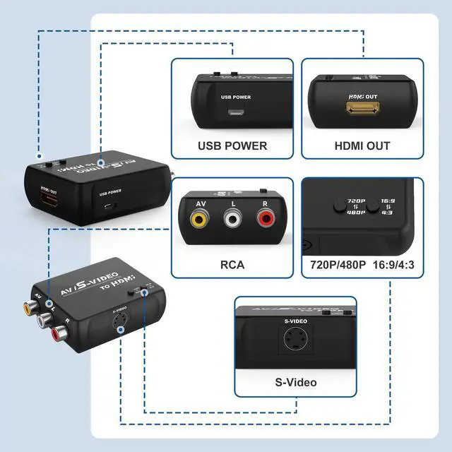 S Video RCA to HDMI Converter with RCA Cable + S Video Cable + USB Cable
