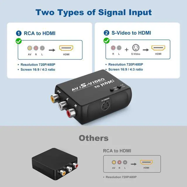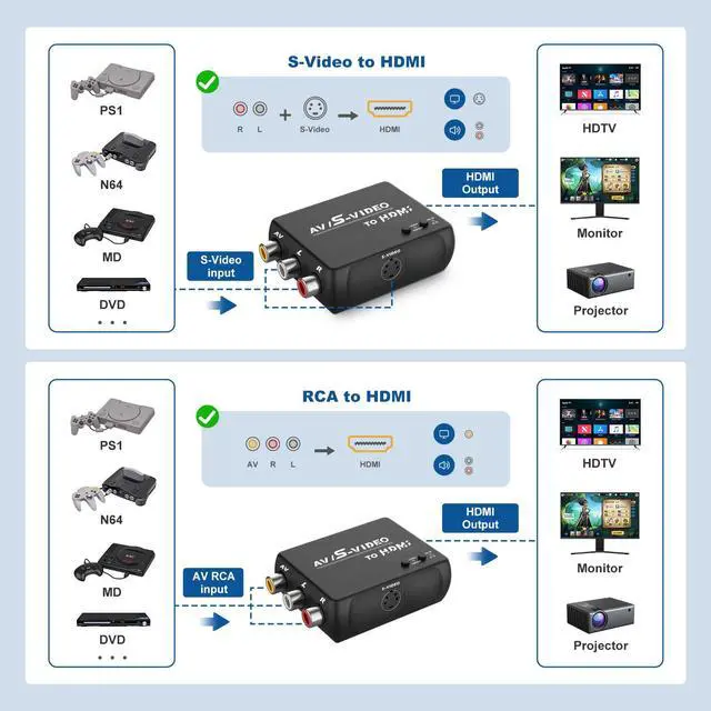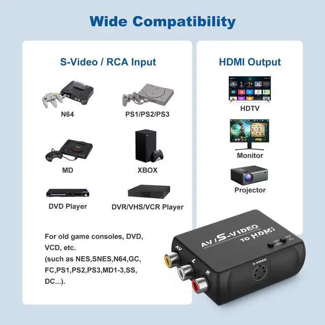 Our RCA + S-Video to HDMI Converter,It converts S-Video/AV (RCA, composite, CVBS) signals into HDMI signals so you can watch your video on a modern TV with HDMI ports.Bring back your old and cherish memories.