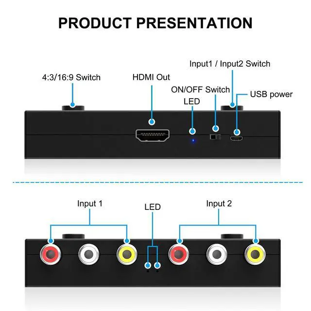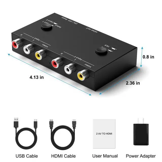 This 2 Port AV to HDMI converter converts analog RCA composite inputs to HDMI 720P/1080p (60Hz) outputs. It allows users to connect 2 RCA devices to an old TV set at the same time and select one of them for display via the switching button. This avoids frequent plugging and unplugging when connecting 2 RCA devices to an old TV set.