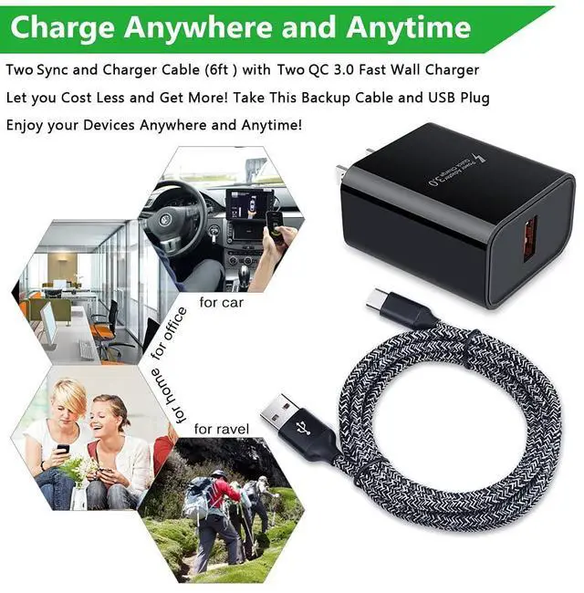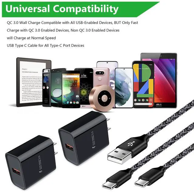Equipped with Max 18W Quick Charge 3.0 charging port on the wall charger, this combination of usb c charger kit is optimized for Fast Charging