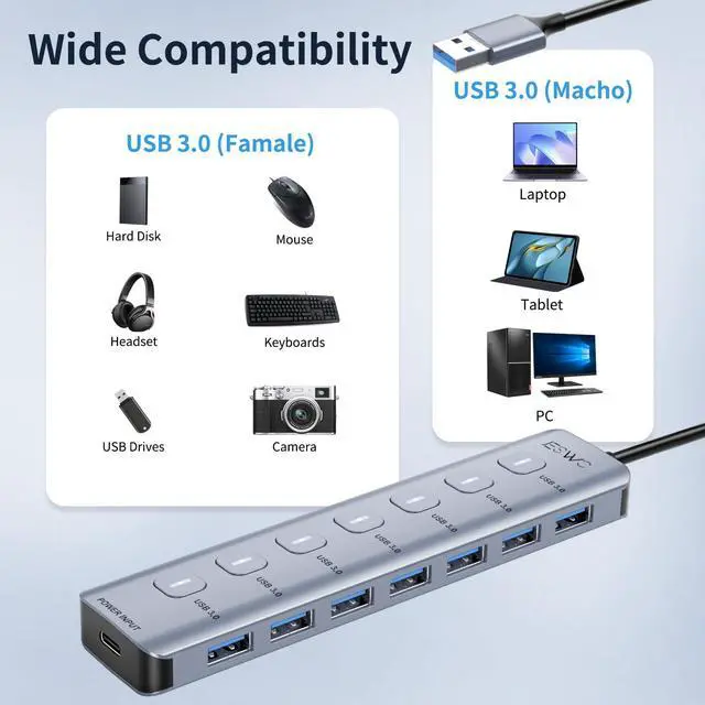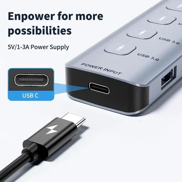 The USB 3.0 hub comes with independent switches to control each USB port, so you don't have to unplug your devices when not in use.