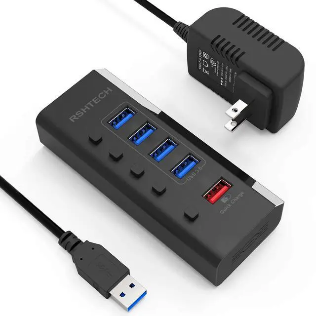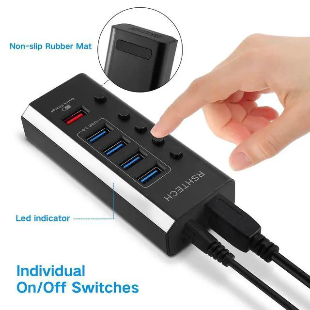 Package including: RSHTECH 5 Port USB Hub with individual switches, 12V/2A power adapter, 3.3 ft long USB 3.0 detachable cable, user manual