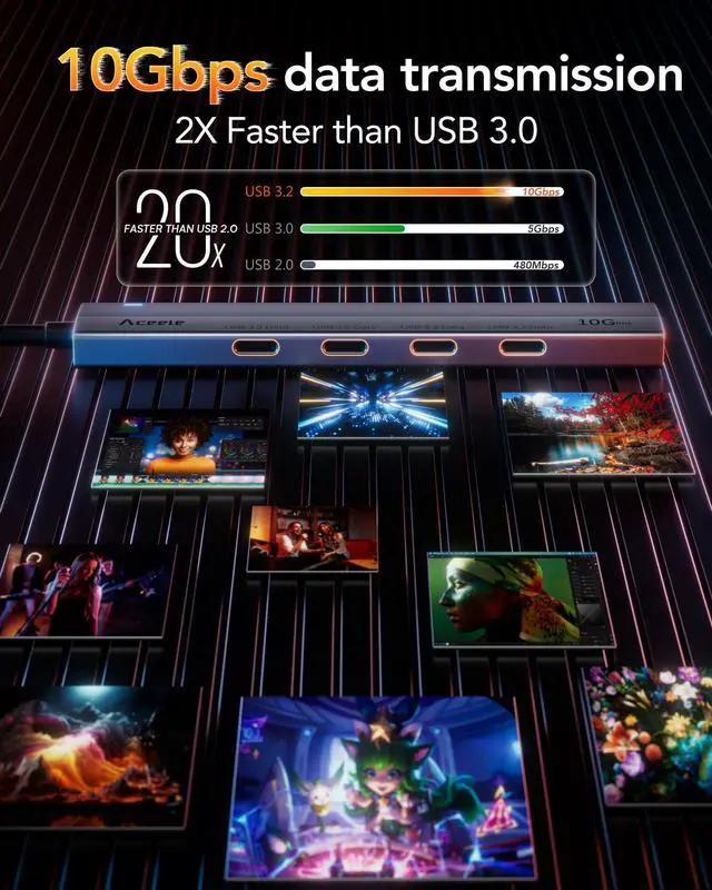 10Gbps High-Speed Data Transfer- Aceele USB C Hub adopts USB 3.2 Gen 2, the new generation of USB standard, Data Transfer Speeds up to 10 Gbps (2X faster than USB 3.0), This USB C Splitter can Transfer or Backup your Data Quickly and Efficiently! (NOTE: If the USB C splitter interface of the host device is lower than USB 3.2, it will also affect its final transmission speed.