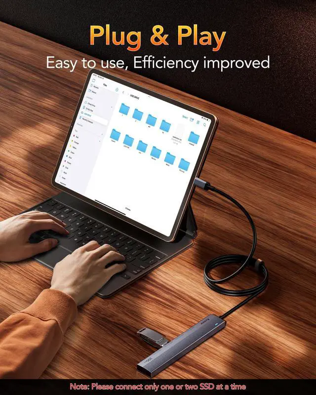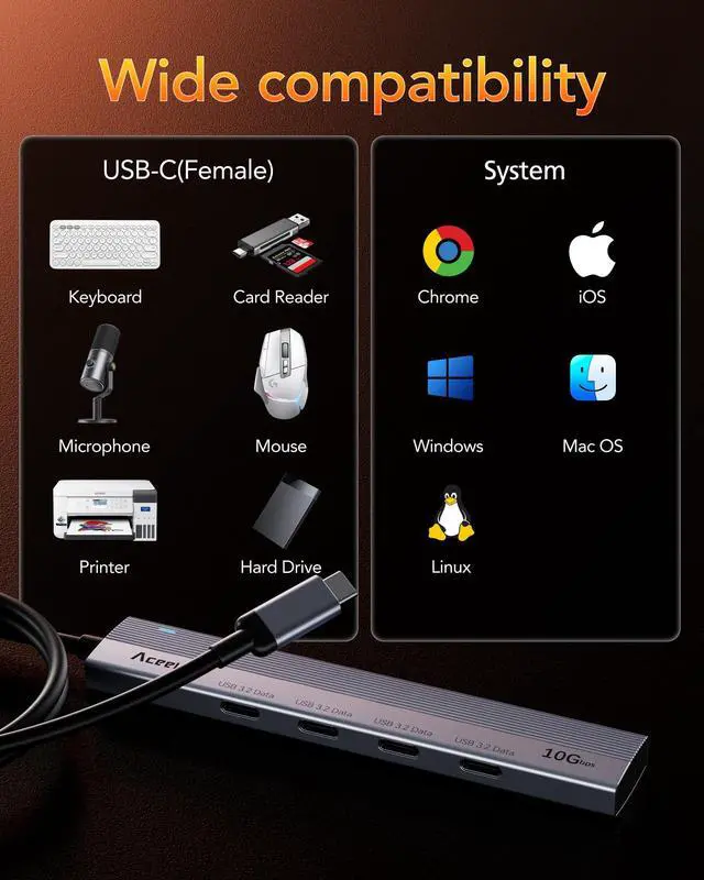 Wide Compatibility The USB 3.2 Hub is compatible with MacBook Pro 2022/2021, MacBook Air 2022/2020, iPad Pro 2022/2021, Surface Pro 9/8/7, Surface Go, Surface Book 3, Galaxy S23/S23+/S23 Ultra/S22/S21, etc. (not all types).
