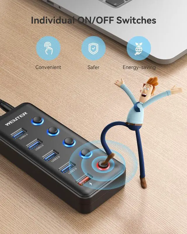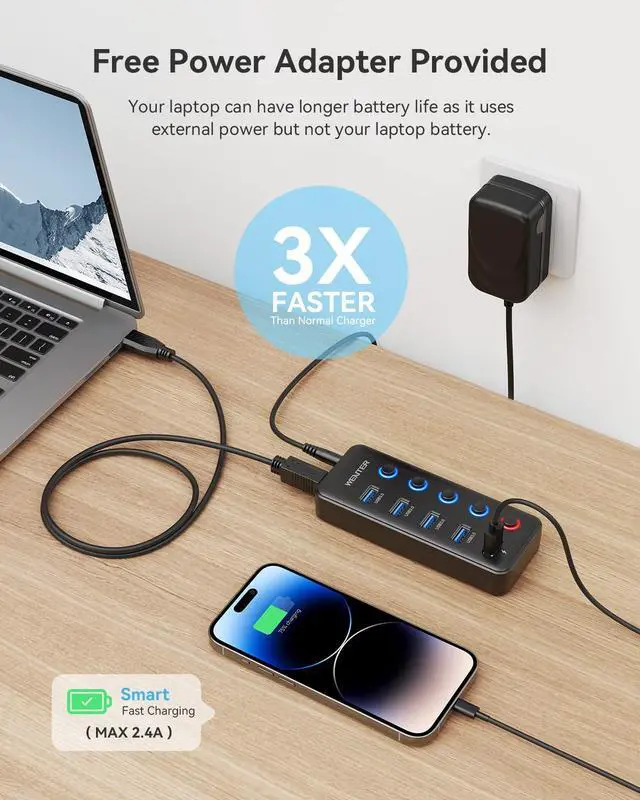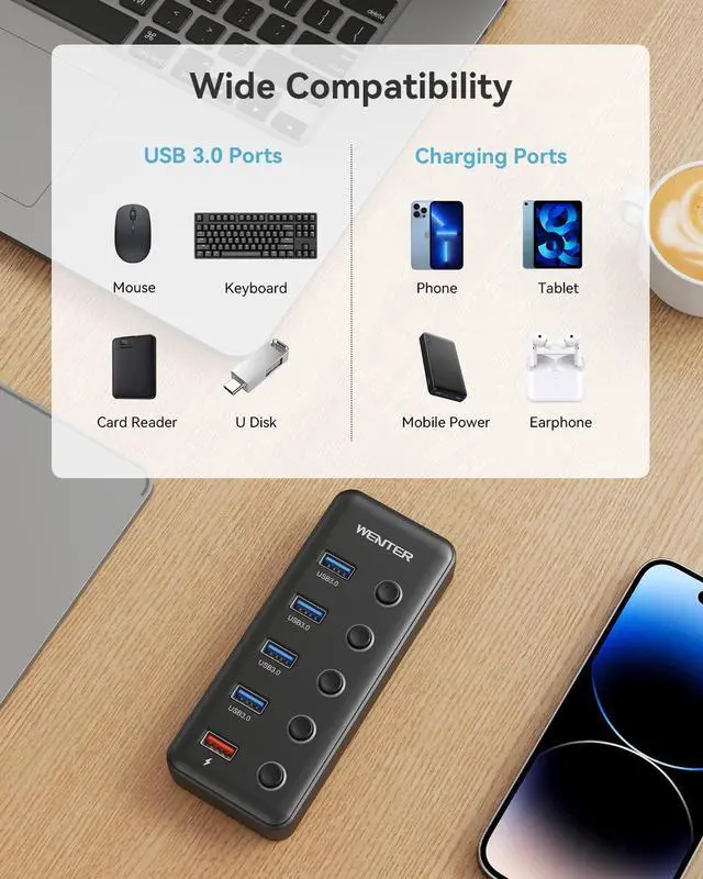 WENTER 5 Ports Powered USB Hub is specially designed for you! It expands 5 USB 3.0 data transfer ports and 1 smart charging port for faster charging and data transmission.