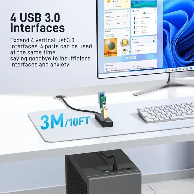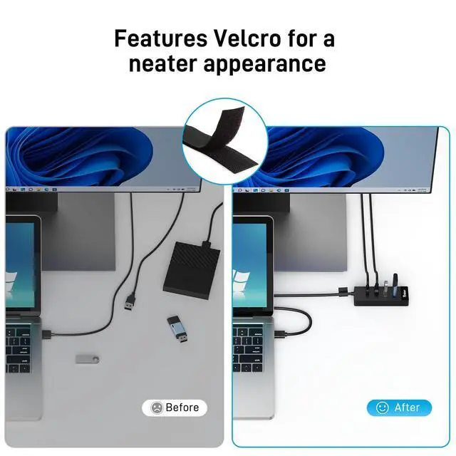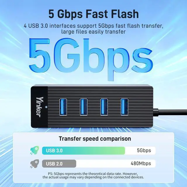 | 3. This USB hub can work at 5Gbps when connects to USB 3.0 port, its transfer rate is only 480Mbps when connects to USB 2.0 port. |