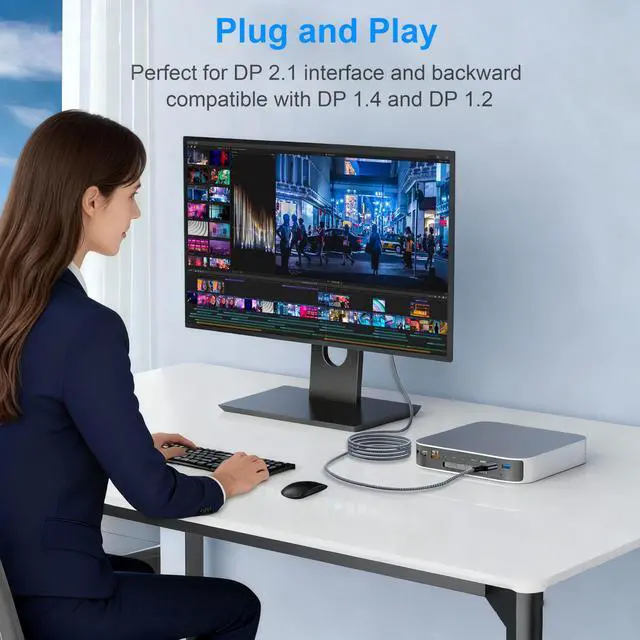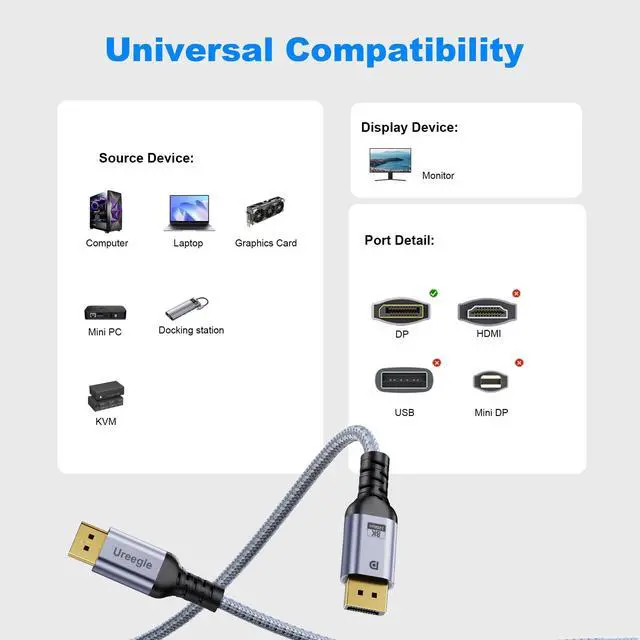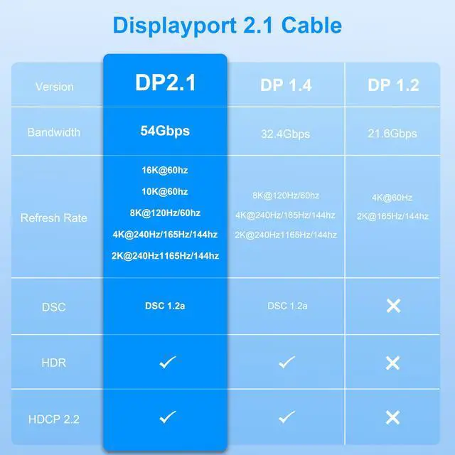 16K&54Gbps DisplayPort Cable 2.1Our 16K 6.6FT Displayport cable 2.1 (Not HDMI) delivers ultra-high bandwidth of up to 54Gbps; The DP 2.1 Cable supports high resolutions like 16K(15360*8640)@60Hzwith DSC, 10K@60Hz, backward compatible with 8K@/60Hz, 4K@240Hz/165/144Hz, and 2K@360Hz/240/165/120Hz and more; This is the only Display Port cable you'll need for the next decade; It's also backward compatible with DisplayPort 2.0, 1.4, 1.3, and 1.2; Important: Only for DP to DP connections, Not HDMI or Mini DP