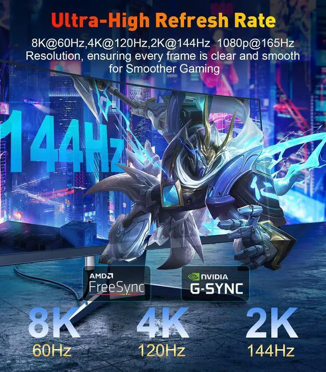 - Support resolution 8K@60Hz/4K@120Hz/2K@144Hz/2K@144Hz/2K@120Hz/1080p@60Hz - Does not support 2K@240Hz