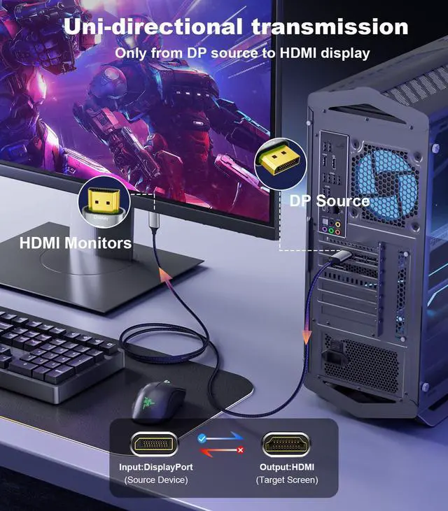 Uni-Directional 8K DisplayPort 1.4 to HDMI 2.1 Cable (Compatible DP 1.1/1.2-HDMI 2.0)