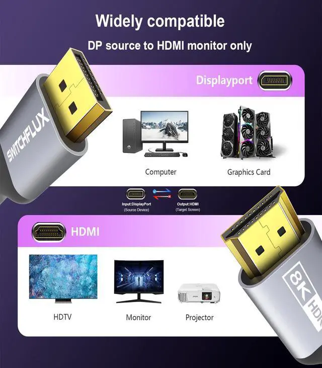- This is a one-way cable, only support from displayport source to hdmi display, not support hdmi source to displayport display