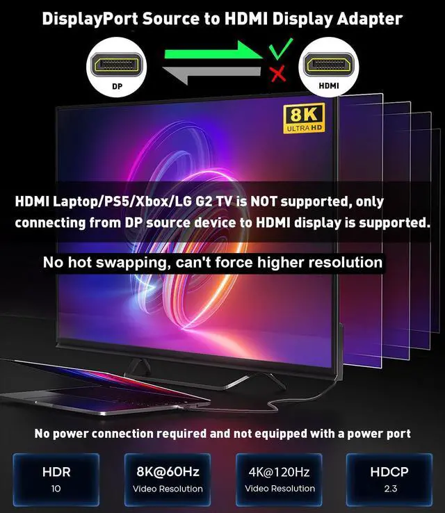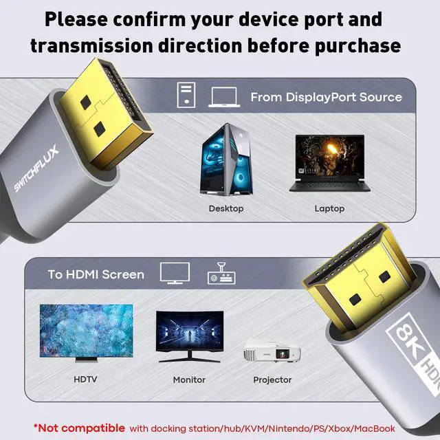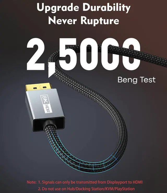 ![Alt view image 7 of 7 - 6FT DisplayPort to HDMI 8K Cable [8K@60Hz,4K@120Hz,2K@144Hz] Uni-Directional DP Source to HDMI Display, DisplayPort 1.4 to HDMI 2.1 Braided Cord for AMD,NVIDIA](https://c1.neweggimages.com/productimage/nb640/C5MSD2603180L4M6A0A.jpg)