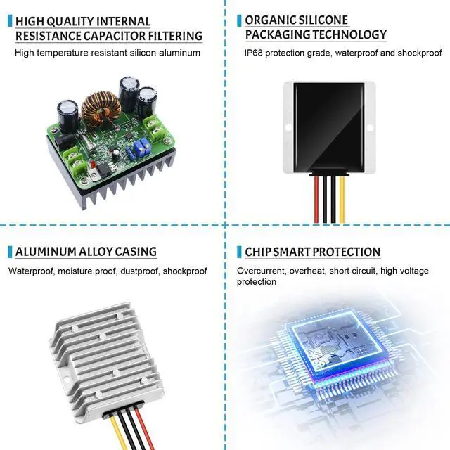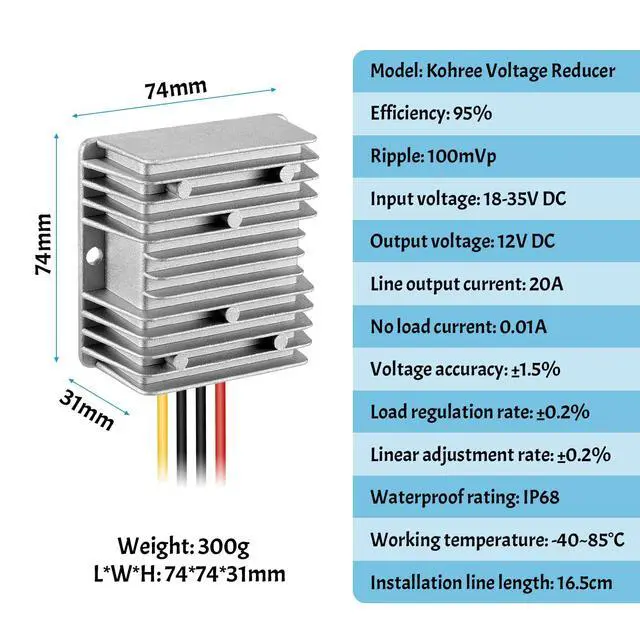 Kohree waterproof power converter regulator, adopting synchronous voltage regulator technology and full import original components, can convert unstable voltage DC 24V to stable DC 12V 20A output.