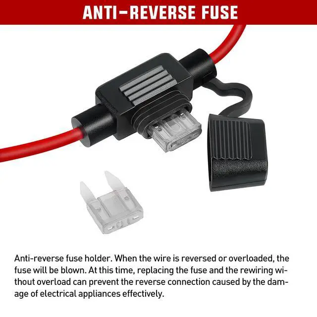 With anti-reverse fuse holder. When the wire is reversed or overloaded, the fuse will be blown. At this time, replacing the fuse and the fuse and rewiring without overload can prevent the reverse connection caused by the damage of electrical appliances effectively.