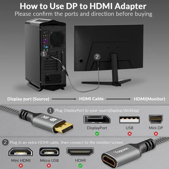 DisplayPort to HDMI Adapter : Togconn DP to HDMI short adapter is specifically designed to connect DP devices to HDMI ports. You can connect your laptop, PC, desktop with DP source to larger screens (such as monitors, televisions and projectors) with HDMI port for video streaming or gaming. (Note : Uni-directional, only from DP input to HDMI output.)