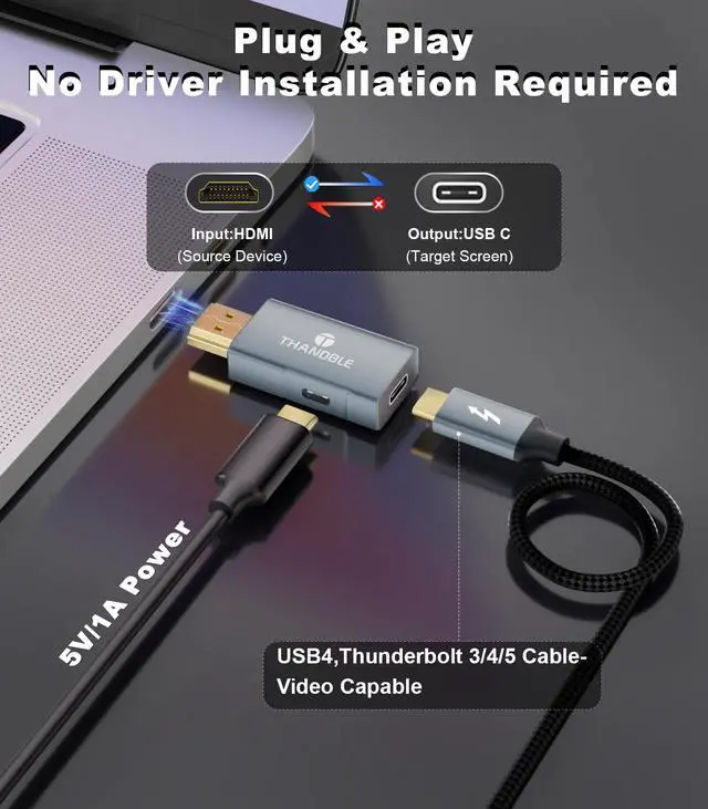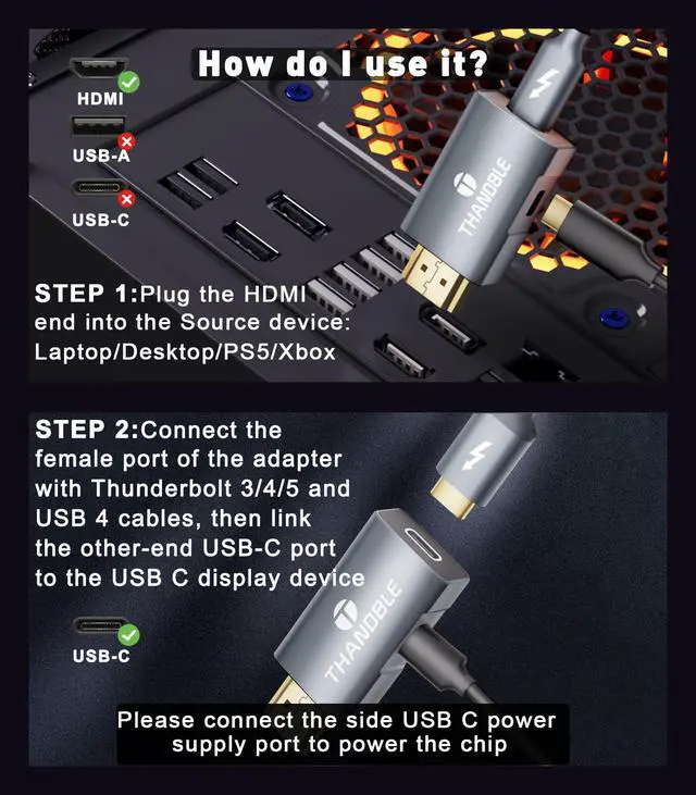 Plug & Play, Zero Hassle Setup: Compared to traditional adapters, this HDMI Male to USB C Female Adapter uses an advanced IC chip to convert HDMI signals to USB-C signals, plug it into HDMI-equipped devices, and USB C display devices connected using cables with specifications of USB 4 or Thunderbolt version 3/4/5. (Note: Make sure to plug in the supplied USB power cord to power the built-in chip for the most stable display. The power cord cannot reverse charge the display device)