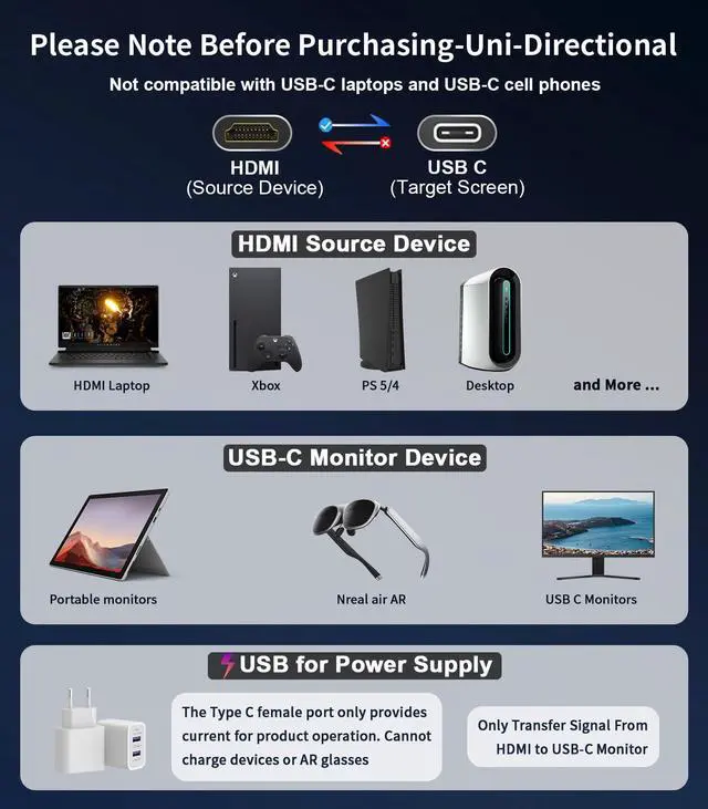 Wide Compatibility: This adapter only supports signal transmission from HDMI source devices to USB C display devices, for office or gaming, you can totally trust this HDMI to USB-C adapter, it is compatible with all HDMI (source) output devices on the market, such as Laptop, PC, XBox, PS4/ PS5, etc. Compatible with compatible Rokid Max/ Air, RayNeo, VITURE One AR glasses and convenient monitors with USB C (Note: Not compatible with KVM/Hub/Dock together)