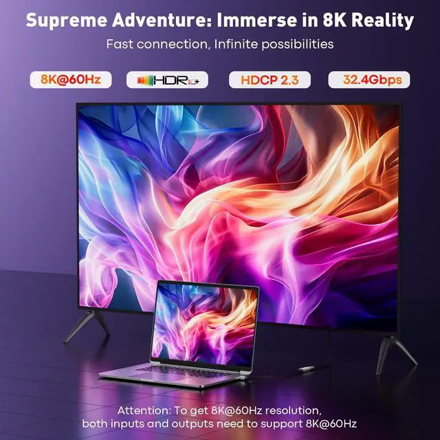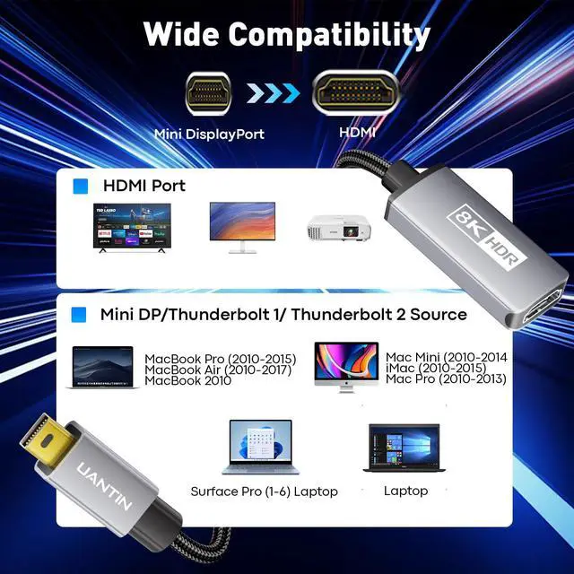 [8K Ultra HD] The UANTIN Mini DisplayPort 1.4 to HDMI 2.1 adapter supports 8K4K@120/60Hz2K@144/120Hz ultra-high definition resolution, providing smooth images without blurring and accurately reproducing every detail to deliver cinema-quality picture quality. Whether it's high-definition movies, design drawings, or game graphics, it eliminates lag and tearing to provide a smooth and seamless visual experience.